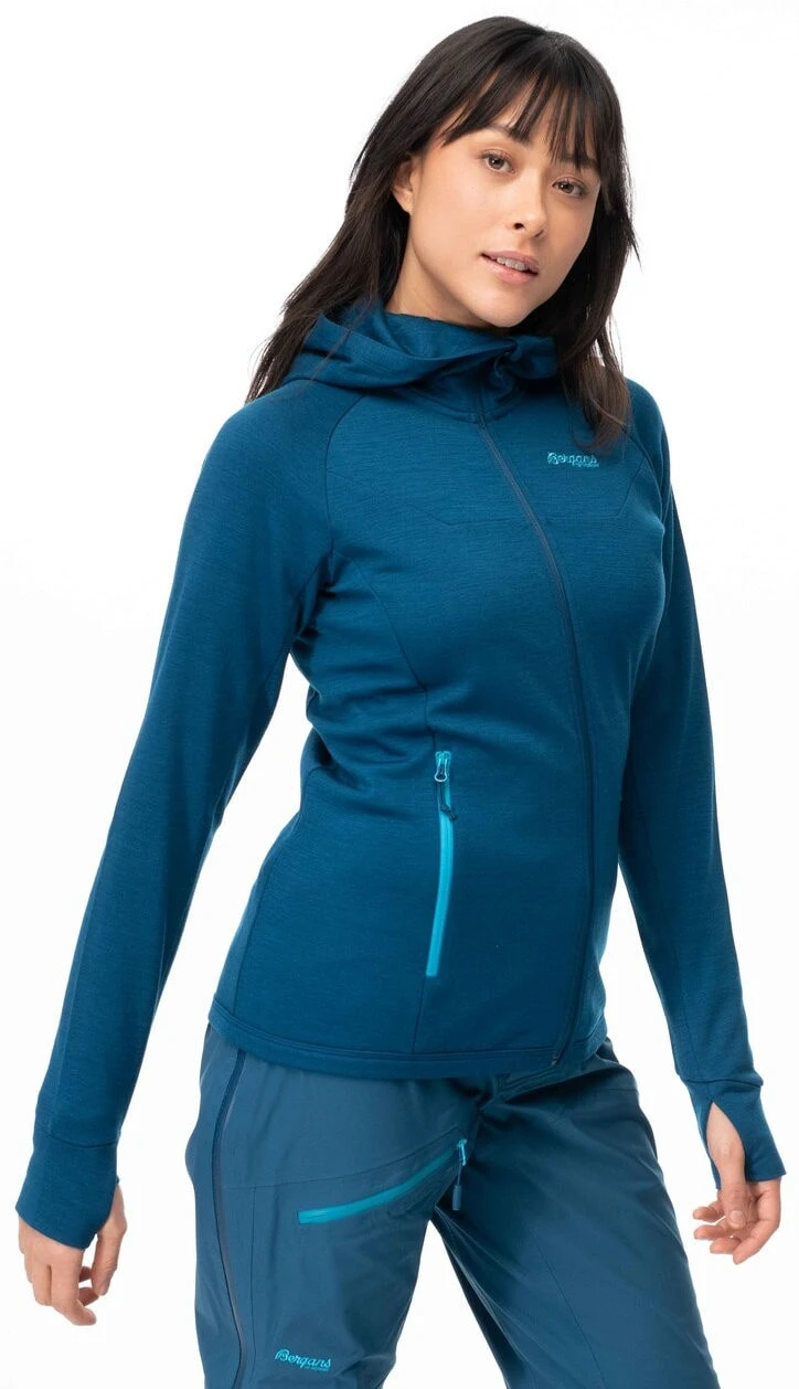 Das Cecilie Wool Hood Jacket Women von Bergans ist durch den Materialmix aus Merinowolle und recyceltem Polyester super bequem und gemütlich, isoliert angenehm und wärmt noch in feuchtem Zustand.