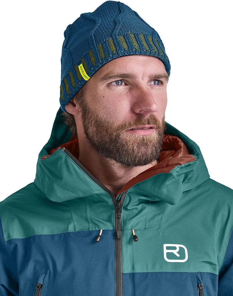 Die 2-Lagen-Jacke kombiniert die Eigenschaften einer Hardshell mit hervorragenden Isolationseigenschaften: Von außen schützt die wind- und wasserdichte Hochleistungsmembran DERMIZAX® EV, innen wärmt SWISSWOOL BLACK, die seltene Wolle der schwarzen Schafe aus den Schweizer Alpen. Die 60 g/m2 Wattierung ist in Front, Rücken, Ärmel und Kapuze integriert. Weitenregulierbare Ärmelabschlüsse mit Innenbündchen halten Fahrtwind und Schnee draußen und passen bequem über die Handschuhe. In den großen Fronttaschen lassen sich wichtige Dinge sicher verstauen, eine integrierte Handytasche aus Merino-Mesh schont den Akku. Eine aufgesetzte Ärmeltasche für den Skipass sowie zwei weitere Innentaschen runden die Funktionsdetails ab. Die zweifach-regulierbare Kapuze ist helmkompatibel und bietet zusätzlichen Schutz.