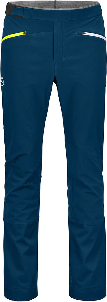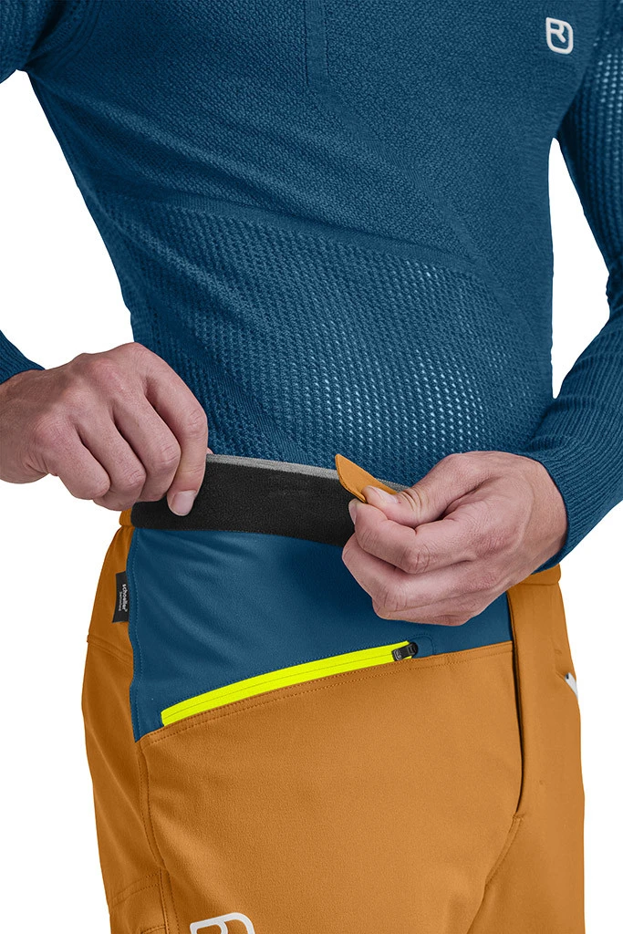 Die Skitourenhose mit Bundöffnung und Reißverschluss hat ergonomisch vorgeformte Kniebereiche und bietet durch das elastische Material besonders viel Bewegungsfreiheit. Die Beinabschlüsse sind ebenfalls elastisch und schließen gut ab. Kleinigkeiten wie eine Karte finden in den zwei Hüfttaschen oder der Oberschenkeltasche ihren Platz. Der rundum laufende Schnittkantenschutz macht sie robust und langlebig.